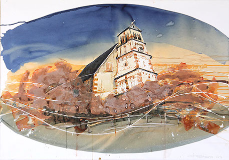"BERGKIRCHE" 100 X 70 AQUARELLPAPIER, FARBIGE TUSCHE