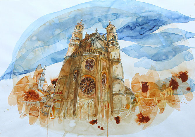"KATHEDRALE" 100 X 70 AQUARELLPAPIER, FARBIGE TUSCHE