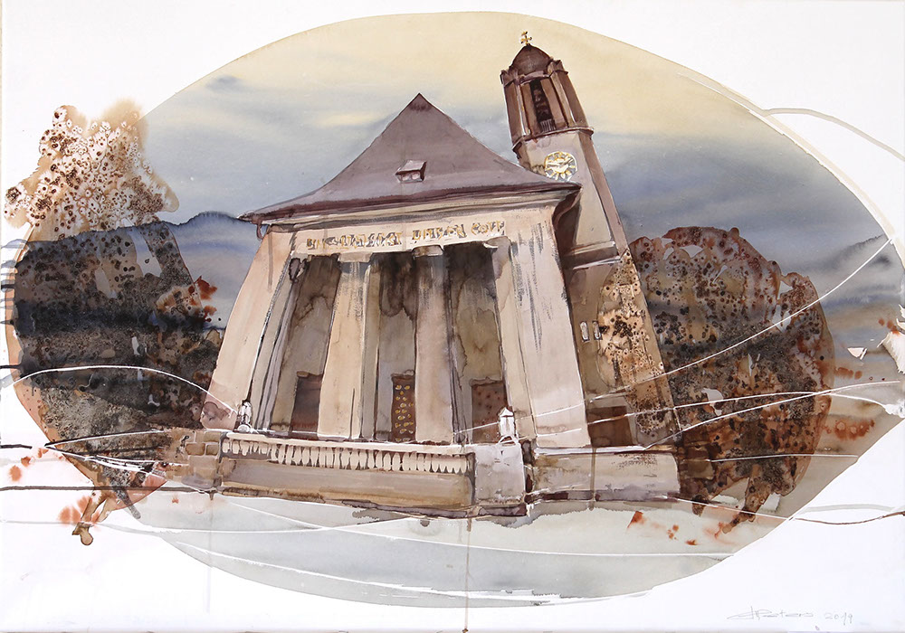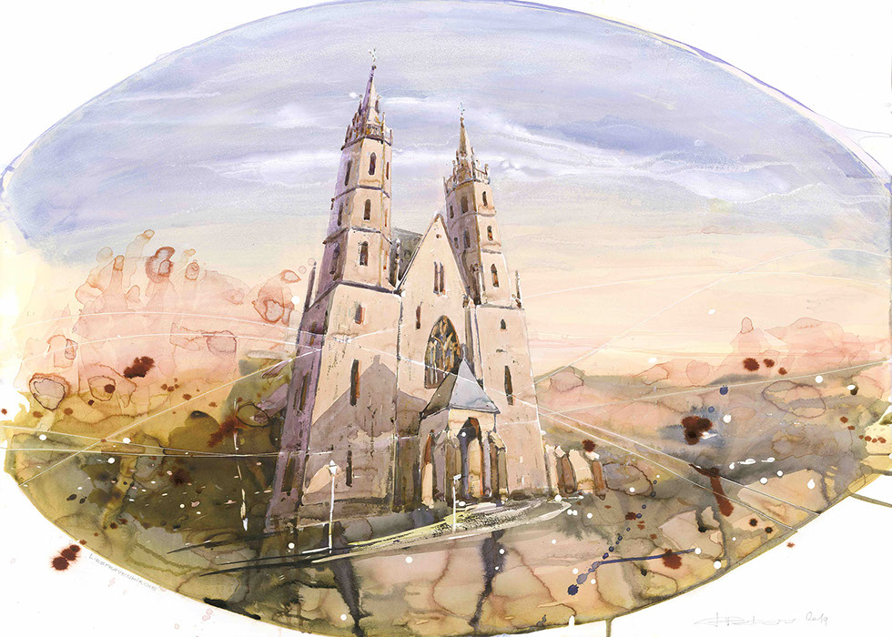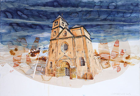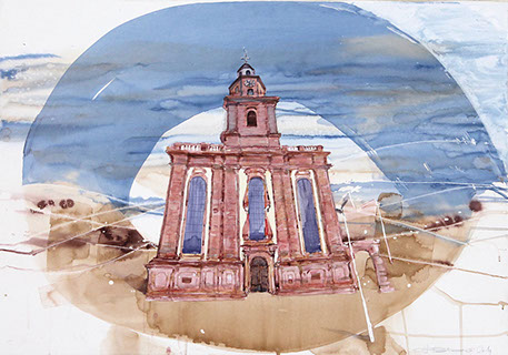 "DREIFALTIGKEITSKIRCHE" 100 X 70 AQUARELLPAPIER, FARBIGE TUSCHE