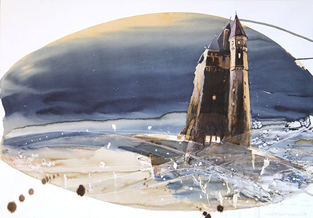 "NIBELUNGENTURM" 100 X 70 AQUARELLPAPIER, FARBIGE TUSCHE