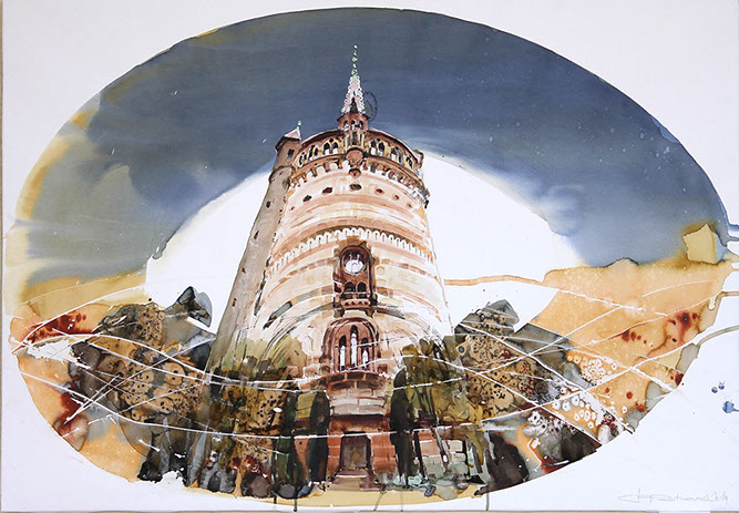 "WASSERTURM" 100 X 70 AQUARELLPAPIER, FARBIGE TUSCHE